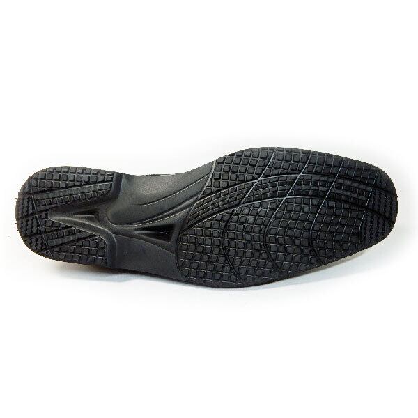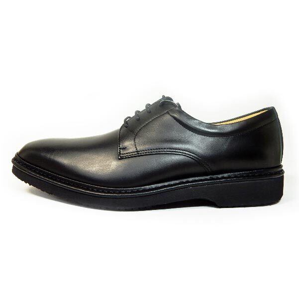 甲革はソフト牛革で非常に柔らかく、ソールも軽いうえクッション性に優れ、大変履きやすい革靴です。土踏まずのアーチサポートと、中足骨のアーチサポートのパッドが内蔵されたコンフォート性のあるインソールで、歩行時の疲労を軽減します。また、かかと上部にもパッドが入っており、踵のフィット感を高め靴擦れを防止します。足幅も4Eとゆったり設計で、幅広・甲高の方にも是非おすすめです。ソールは、スニーカーソールのような形状の特殊スポンジラバーで、軽量かつ耐久性・クッション性に優れ、革靴でありながらスニーカーのような快適な履き心地を実現。国産(日本製)のしっかりした造りの紳士靴で履きよいため、当店ではリピーターが多く定番的に人気のある靴です。デザインもオーソドックスかつシャープで、あらゆるビジネスシーンで活躍する一足です。