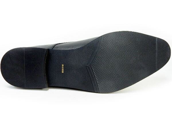 つま先はチゼルトゥのシャープなデザインで、シルエットのきれいな紳士靴です。アッパー(甲革)は良質な柔らかなレザー(牛革)で足馴染みが良く、裏地(ライニングおよびインソール)も天然皮革(山羊革)で吸湿性に富みやわらかな足入れです。ソールは滑りにくい合成ラバーで減りにくい素材を使用。足幅(ワイズ)は4E(EEEE)と幅広甲高で足入れが良く履きよい靴です。